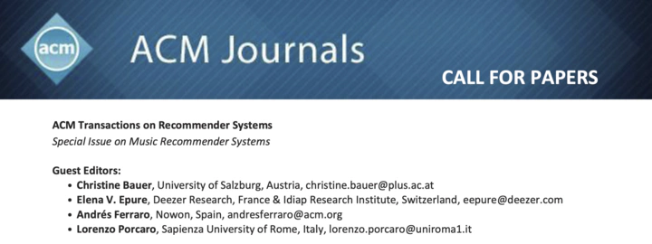 Together with Elena V. Epure, Andrés Ferraro, and Lorenzo Porcaro, I am serving as a Guest Editor for a Special Issue of ACM Transactions on Recommender Systems on ‘Music Recommender Systems’.