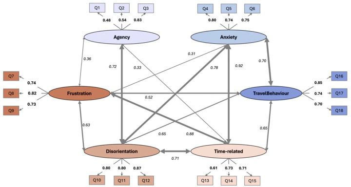 Path diagram illustrating the relationships between scale factors (ellipses) and scale items (rectangles). Bold numbers indicate factor loadings between factors and items, while italicised numbers represent correlations between latent factors. Arrow thickness corresponds to the magnitude of the relationships, with thicker lines indicating stronger correlations.Disruptions in public transport can significantly affect how travelers experience their journeys. While several attempts have been made to improve this experience, reliably measuring the experienced impact of disruptions remains a challenge. To address this gap, we developed and validated the EXperienced Impact of Disruptions Scale (EXID) scale, designed to capture the multifaceted nature of disruption experience from the traveler’s perspective. To construct and validate the scale, we followed a structured, multi-stage process. We first derived an initial pool of items based on prior literature, which were then refined through expert review (n = 3). We pre-tested the selected items through cognitive interviews (n = 5) and conducted an exploratory factor analysis on survey data (n = 350) to refine the scale and assess reliability. Based on a second survey (n = 209), we performed a confirmatory factor analysis and evaluated construct validity. Finally, test-retest validity was assessed with a third sample (n = 22). The analysis revealed six interrelated but conceptually distinct factors that constitute the experienced impact of disruption: agency, anxiety, frustration, disorientation, time-related stress, and travel behavior change. These factors reflect the complex and interconnected nature of travelers’ responses to disruptions. The EXID scale is suitable for both research and practice. It can be applied in real-time during a disruption, in retrospect, or for hypothetical travel disruption scenarios. Furthermore, it can be used to evaluate interventions aimed to improve the disruption experience, such as real-time information or alternative transport strategies. Ultimately, EXID provides a robust instrument to quantitatively measure a disruption’s impact on people’s experience and supports the design and evaluation of mitigation strategies in practice.